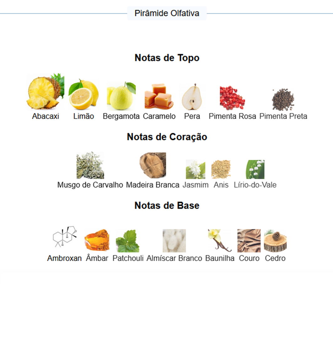 Notas de Fundo: Âmbar, Cedro, Couro, Patchouli, Almíscar branco, Baunilha, Ambroxan
