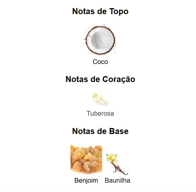 Um perfume feminino que mistura o doce tropical do coco torrado com a sofisticação floral da tuberosa, apoiado por um fundo de baunilha e benjoim que aquece a pele.