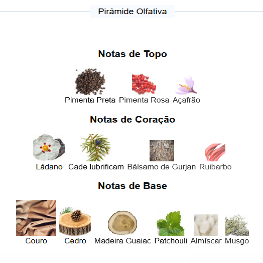 Base: cuero, cedro, pachulí, madera de guaiaco, almizcle, musgo