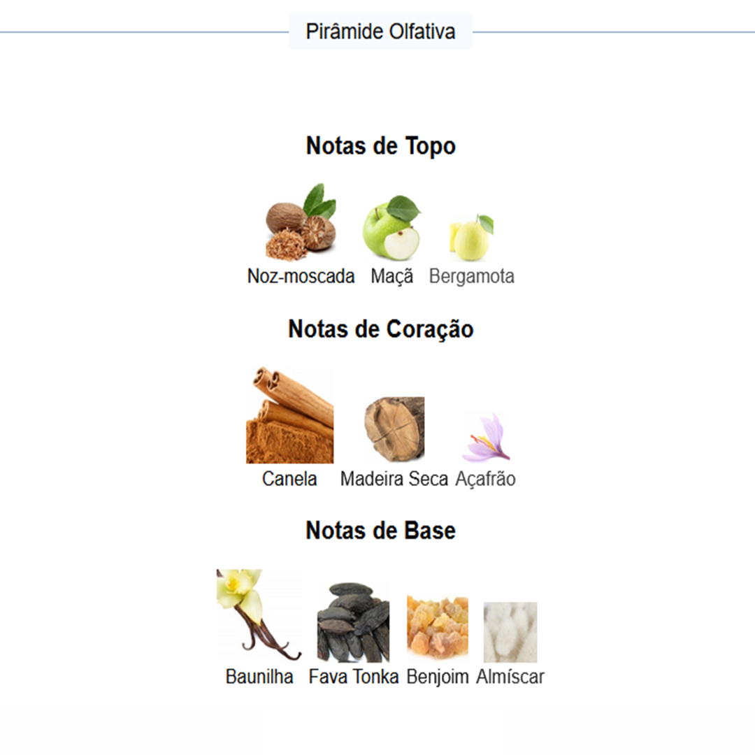 Notas de Coração: Canela, Açafrão, Madeira seca