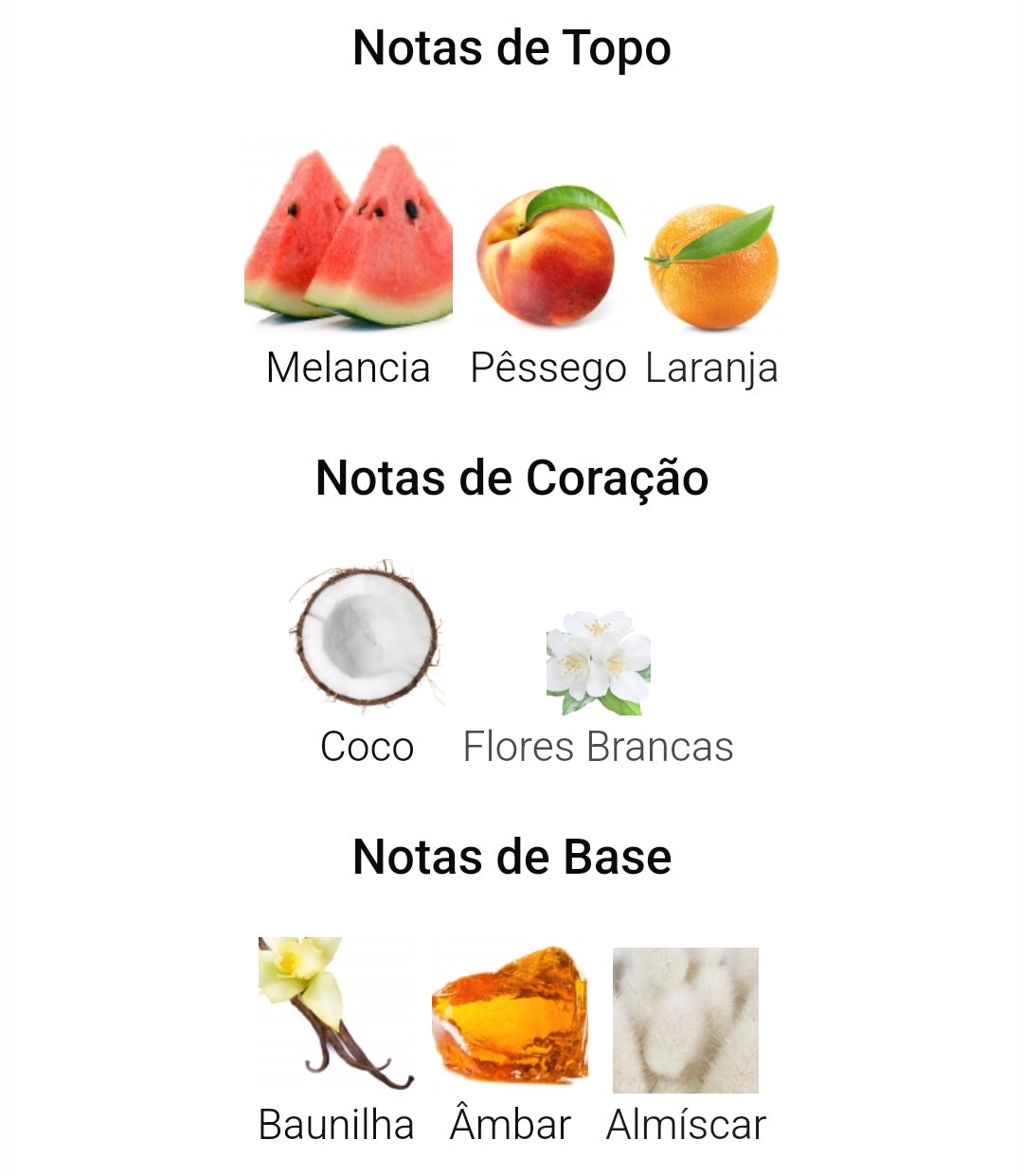 Uma fragrância radiante e envolvente que combina a frescura da fruta com a suavidade das flores brancas e o aconchego de um fundo quente.