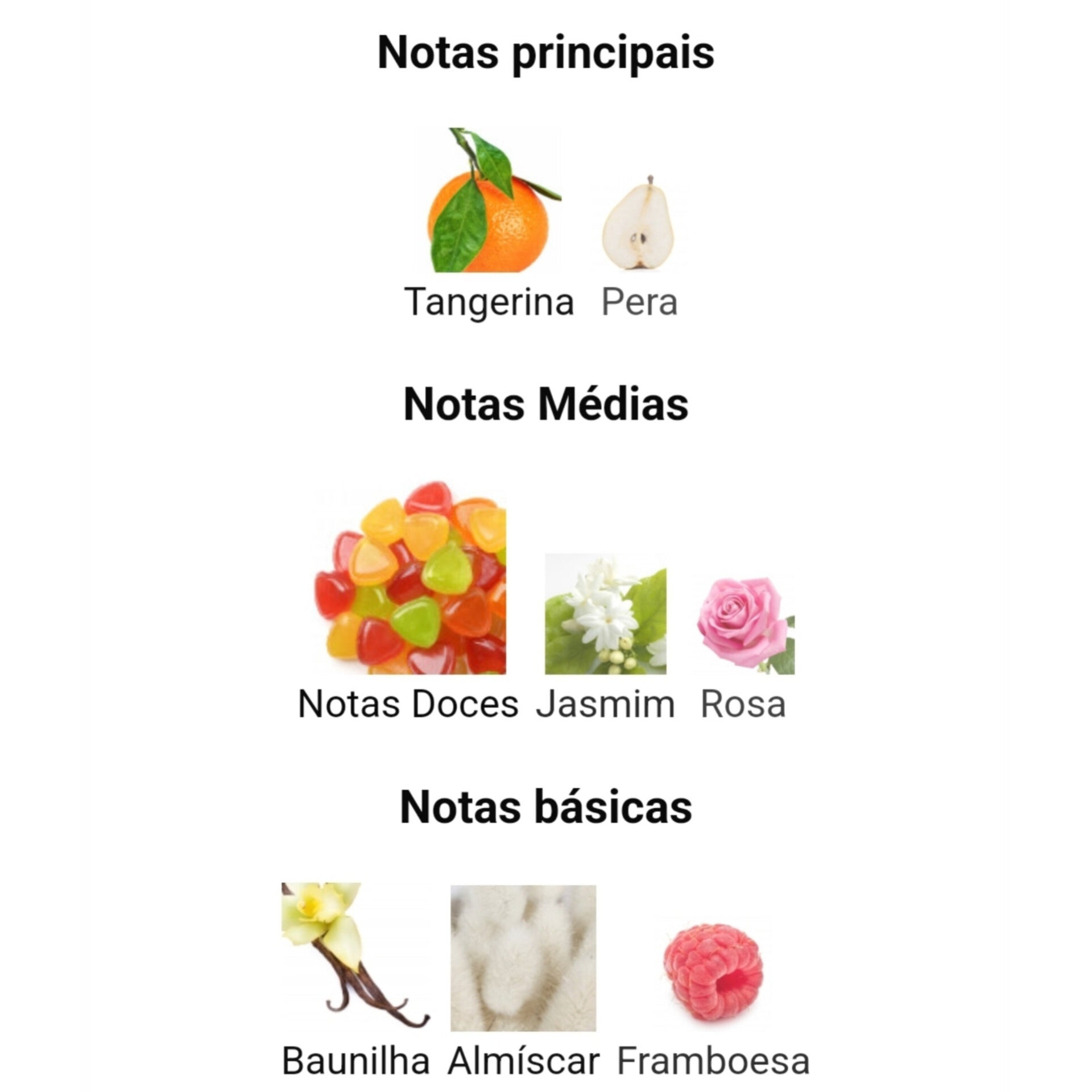 Notas de Fundo: Baunilha, Almíscar, Framboesa
