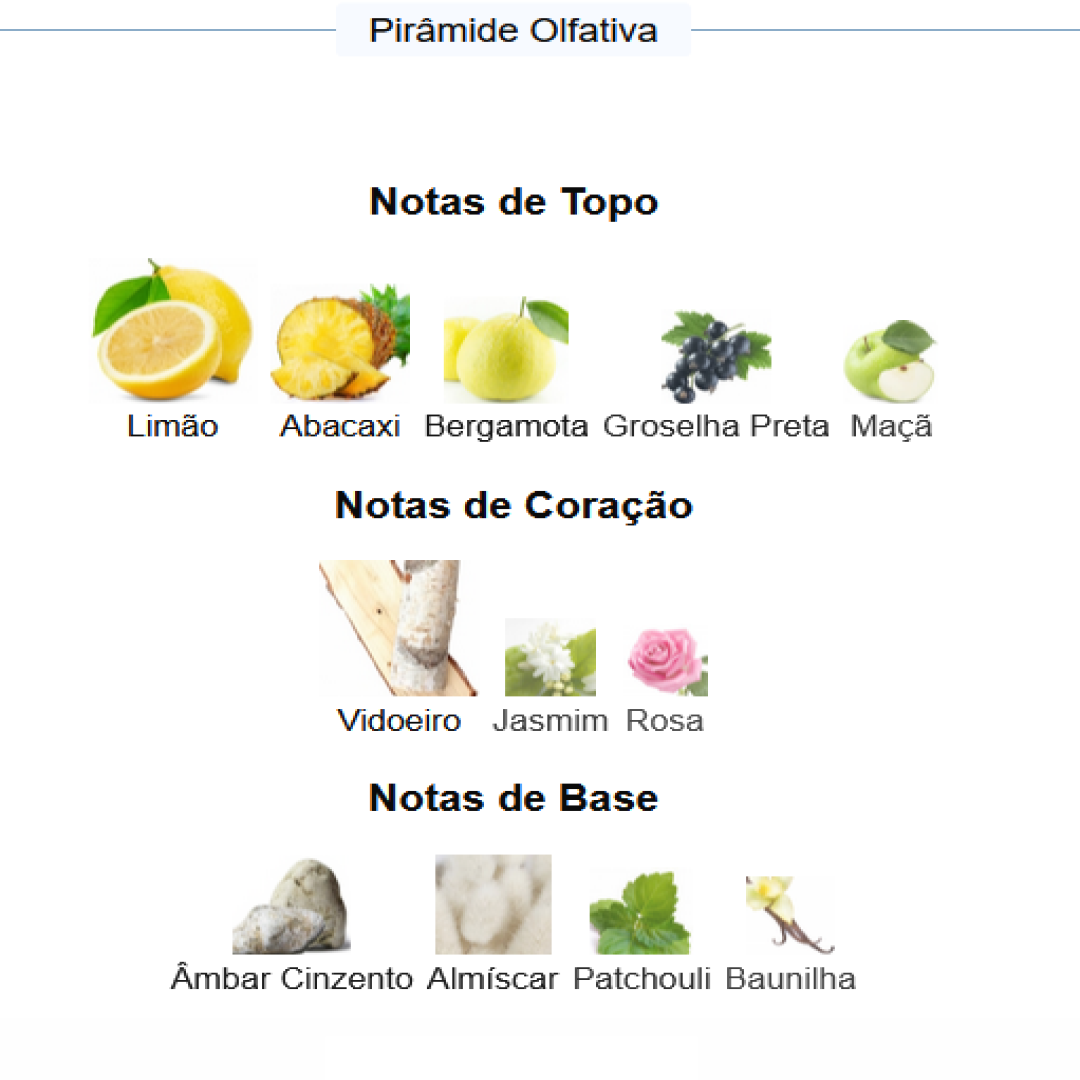 Fundo: Baunilha, Almíscar, Âmbar Cinzento, Patchouli