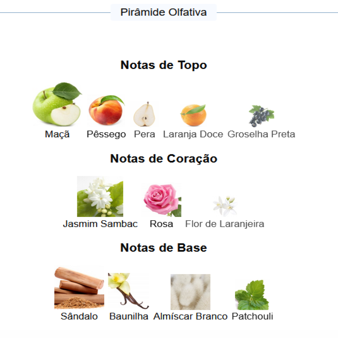 Fundo: Patchouli, Sândalo, Baunilha, Almíscar Branco