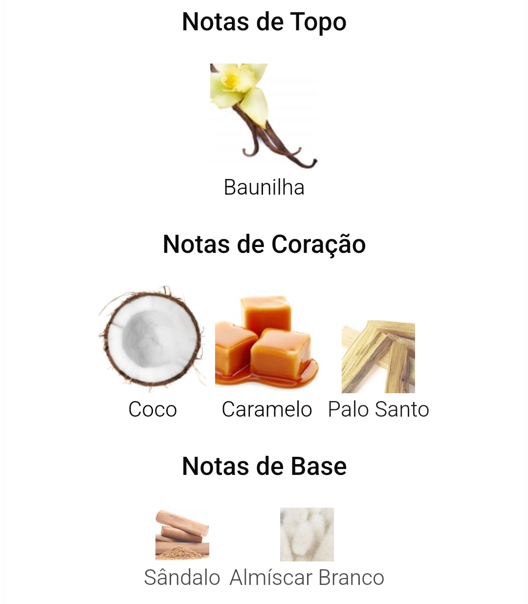 Notas de Coração: Coco, Caramelo, Palo Santo